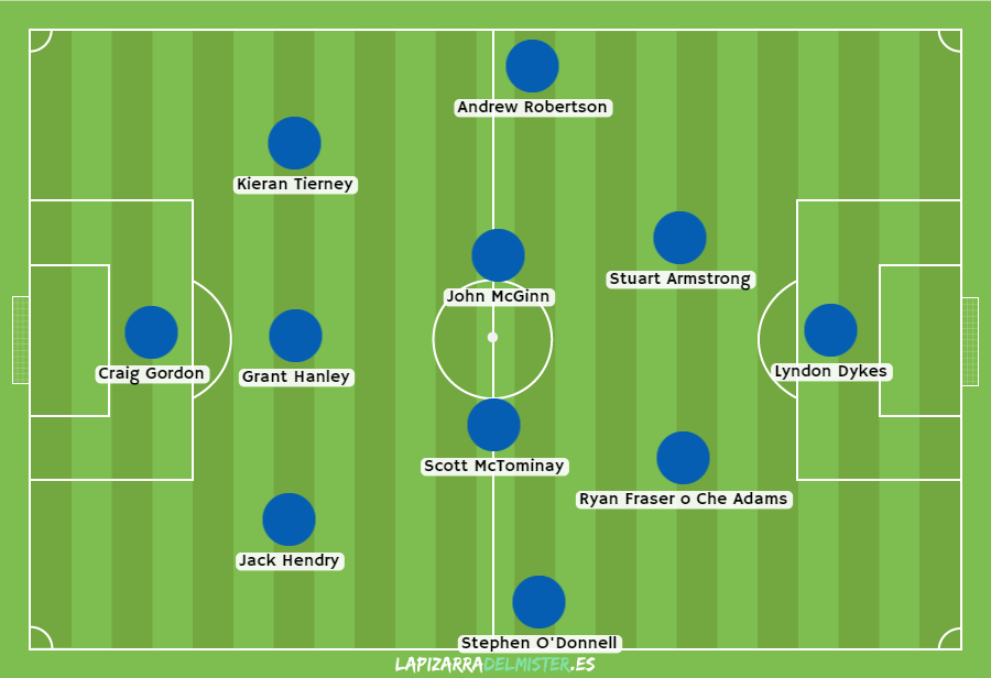 Escocia es una selección británica de antaño. Un equipo que se defiende en repliegue defensivo con un 5-4-1 y que apuesta por el juego directo para hacer daño a su rival, aunque tiene otros registros a tener en cuenta como el centro lateral y la llegada desde la segunda línea de sus mediocampistas. Un equipo de la vieja escuela. No es de meter muchos goles, pese a tener talento con cualidades para ser determinante en el último tramo, pero es muy difícil meterle mano a nivel defensivo. En los últimso partidos han probado cosas diferentes en el once titular, pero se maneja que mantendrá el 3-5-2 como módulo táctico principal.
