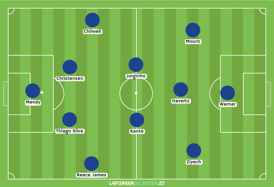 Los mediocampistas de primera línea: Dependiendo de la configuración, debido a que pueden jugar 4-3-3 o 4-2-3-1, Lampard no busca escalonar a sus volantes de primera línea, sino que jueguen a la misma altura y que puedan ocupar varias zonas, pero no de manera constante ni con una intención puntual. En ocasiones Jorginho se ubica entre centrales y Kanté realiza movimientos más agresivos, al igual que lo puede hacer Kovacic.