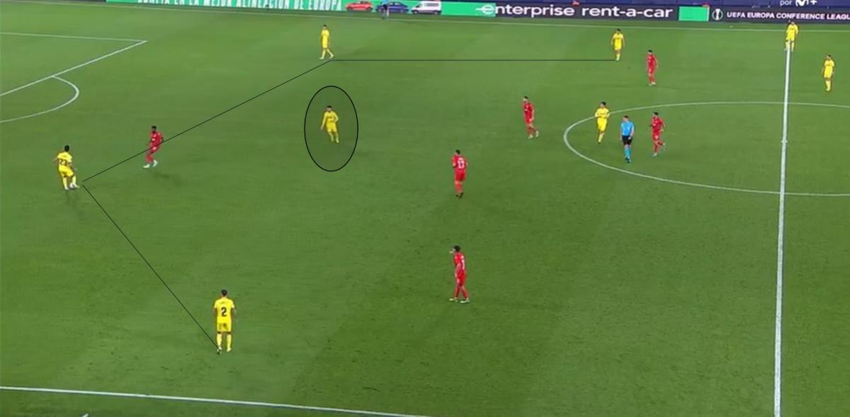 Álex Baena y Manu Trigueros como interiores: Buen partido de ambos alternando alturas, ofreciendo líneas de pase a los centrales (y al mediocentro), apoyando en la base de la jugada para tener superioridad en la zona y verticalizando las jugadas recibiendo en escalones superiores.