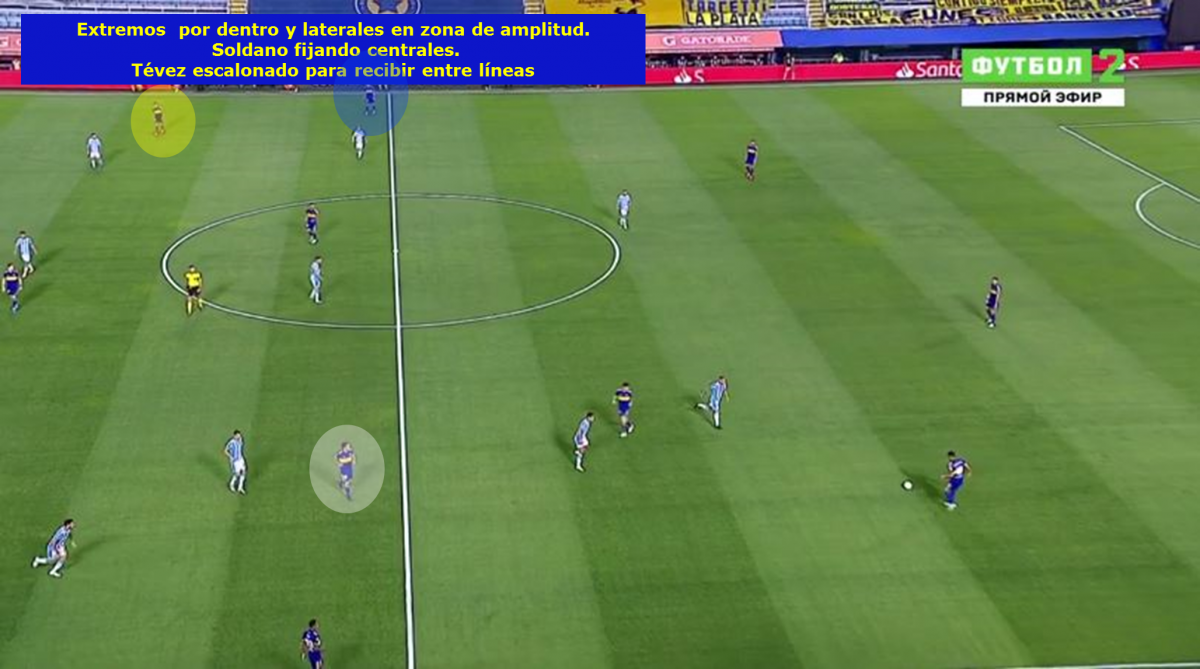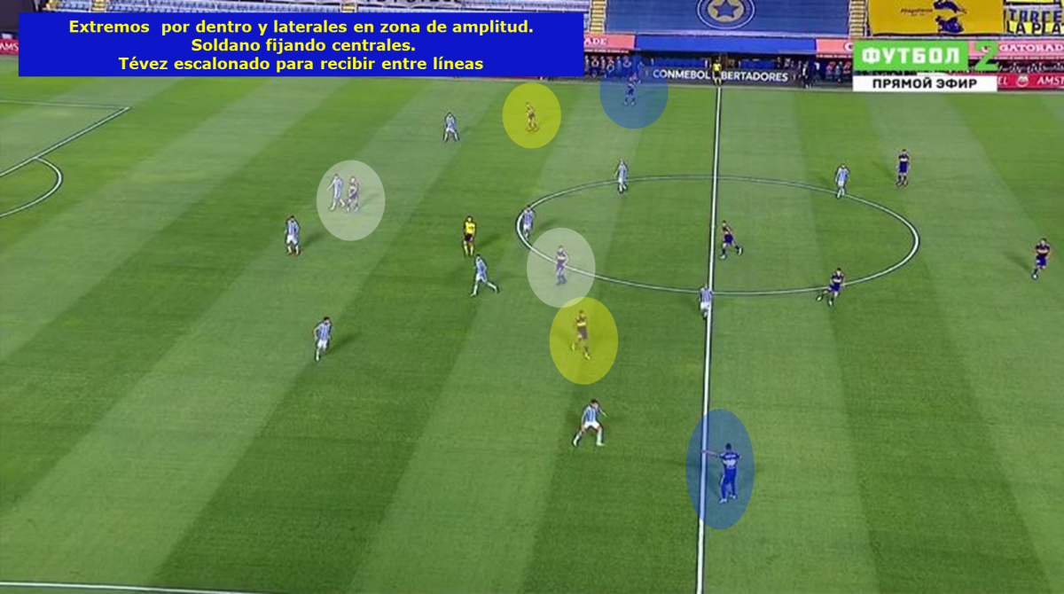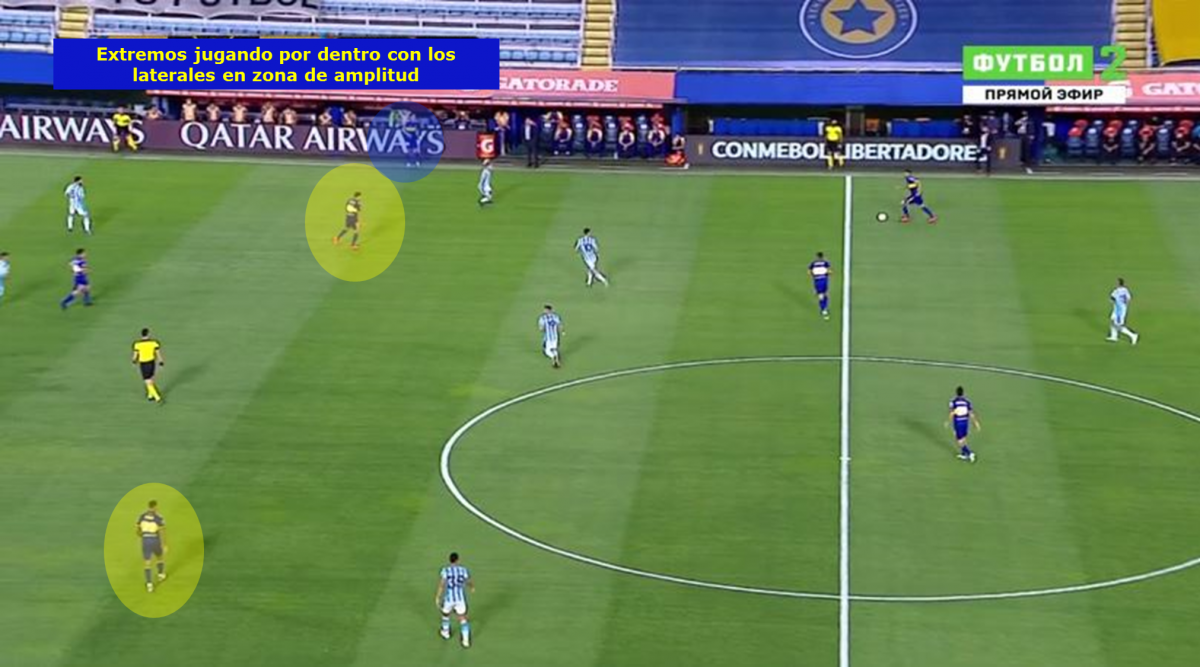 -Posicionamiento ofensivo en ataque posicional: Boca apostó por un posicionamiento con pelota interesante con los extremos jugando en el carril central y con los laterales fijando por fuera para generar esas ventajas en el medio para progresar y atacar la espalda de los volantes de Racing.