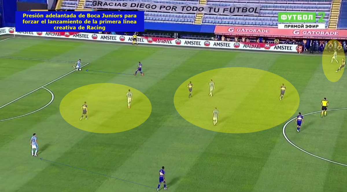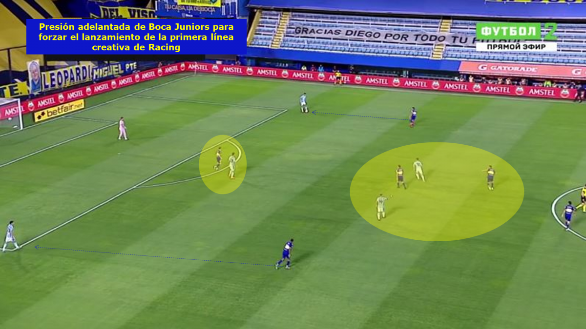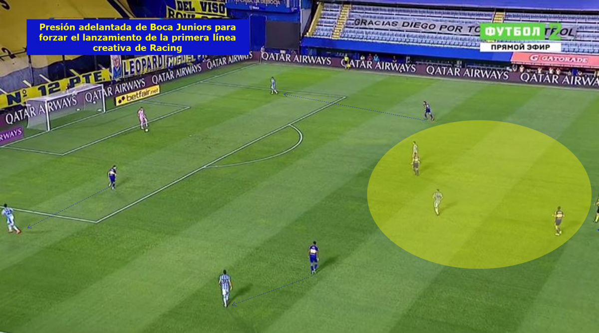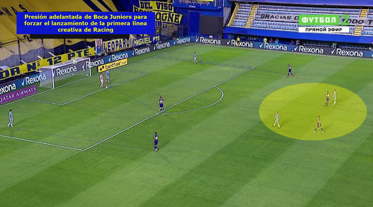 -Presión alta de Boca Juniors: El conjunto xeneize realizó una presión adelantada para forzar el lanzamiento largo de Racing en el inicio de su jugada, una variante con la que siempre busca progresar e ir encerrando a su rival en su propio campo.